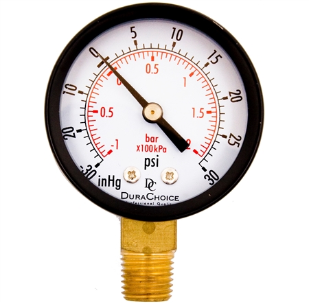 DuraChoice PA204L-V30 dry utility vacuum gauge. 2" dial size. 1/4" NPT lower mount fitting. Steel case with brass fittings. Measures -30HG-30 PSI.