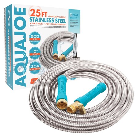 Aqua Joe AJSGH25-MAX-P2 Heavy-Duty Puncture Proof Kink-Free Garden Hose, 25-Foot, 1/2-Inch, w/Brass Fitting & On/Off Valve, Spiral Constructed 304-Stainless Steel Metal