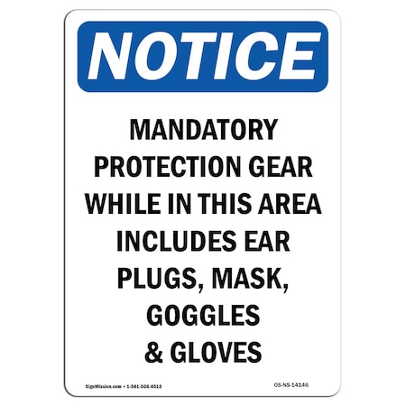 OSHA Notice Sign, Mandatory Protection Gear While, 18in X 12in Rigid Plastic