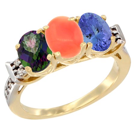 14K Yellow Gold Natural Mystic Topaz, Coral & Tanzanite Ring 3-Stone 7x5 mm Oval Diamond Accent, sizes 5 - 10