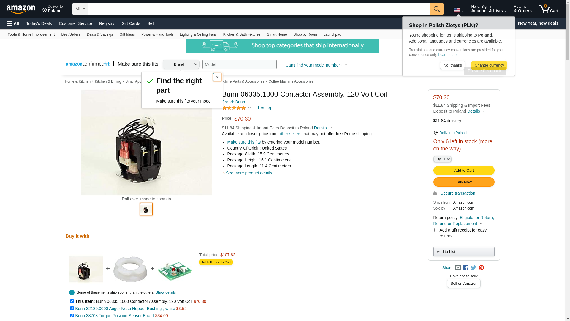 Bunn 06335.1000 Contactor Assembly 120 Volt Coil Kit