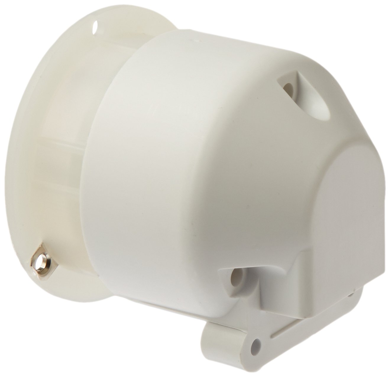 Stainless steel power outlet has gasketed, self-closing cover, watertight when cover is screwed in place. Mounting holes are 2-3/8" (60.3) on centers. Mounting screws and gasket included.