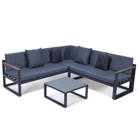 LeisureMod Chelsea 3 Piece Outdoor Patio Sectional Sofa Furniture Set Black Aluminum with Adjustable Headrest & Coffee Table with Removable Seat Cushions & Two Tone Color Throw Pillows, Blue