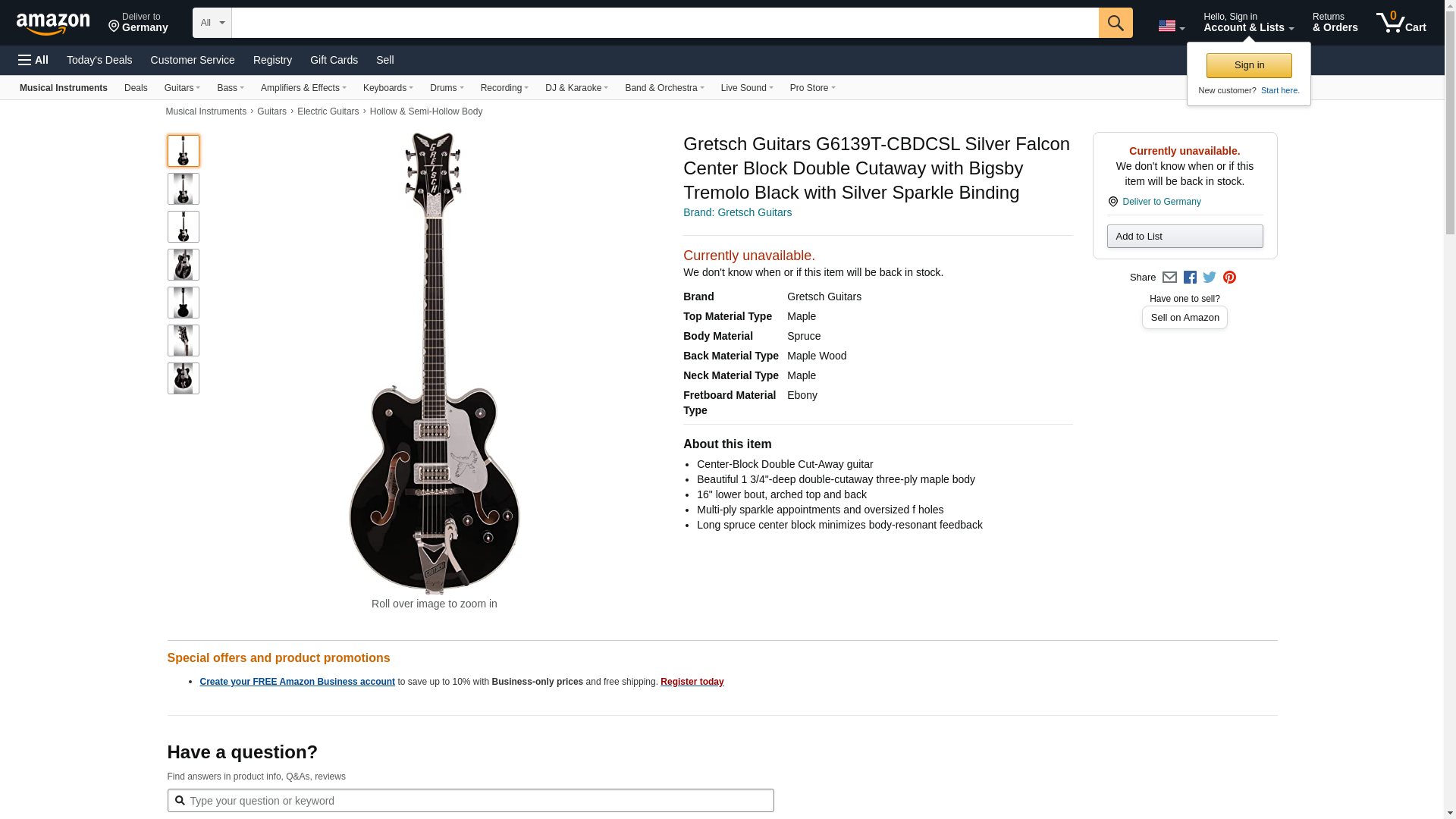 The Gretsch Professional Collection introduces an innovative new version of the venerable Falcon design with the arrival of the G6139T-CBDC Falcon Center-Block Double Cut-Away guitar. It features a beautiful 1 "-deep double-cutaway three-ply maple body with a 16" lower bout, arched top and back, multi-ply sparkle appointments and oversized f holes. The centerpiece of the model is a long spruce center block.The center block runs the entire length of the body and imparts several sonic advantages. First, it minimizes body-resonant feedback and enables a more "high gain-friendly" performance. Second, it s made of spruce, which produces a spirited, lively tone. Third, the center block itself is chambered at the lower bout to minimize weight. Fourth, the pinned wood bridge base extends over the sides of the center block about 5/8" on either side, transferring string-vibration energy to the two f-hole-vented body chambers to produce a rich and full-bodied tone.Other premium features include a three-piece maple neck; 12 -radius ebony fingerboard with 22 medium jumbo frets, pearloid Neo-Classic "thumbnail" inlays and multi-ply sparkle appointments; Gretsch "winged/vertical" sparkle logo; and dual High Sensitive Filter Tron pickups. The guitar also has jeweled-arrow knobs and gold hardware, an Adjusto-Matic bridge with pinned ebony base and Bigsby B6G tailpiece, Grover Imperial tuners and Schaller strap locks. Available in White with Gold Sparkle appointments and Black with Silver Sparkle appointments. Deluxe hard-shell case included.