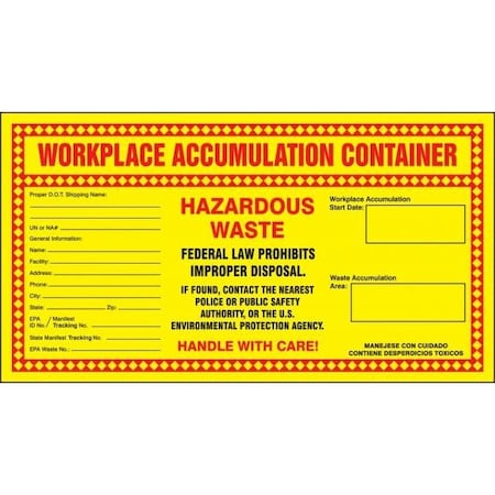 Accuform MHZW22PSC Adhesive Coated Paper Hazardous Waste Label, Legend "WORKPLACE ACCUMULATION CONTAINER - HAZARDOUS WASTE FEDERAL LAW PROHIBITS IMPROPER DISPOSAL...HANDLE WITH CARE!", 6" Length x 11"
