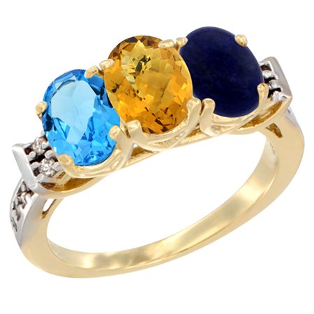 10K Yellow Gold Natural Swiss Blue Topaz, Whisky Quartz & Lapis Ring 3-Stone Oval 7x5 mm Diamond Accent, sizes 5 - 10