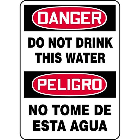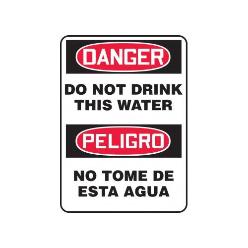Bilingual OSHA DANGER Signs (English & Spanish) - Do Not Drink This Water, 14" x 10". Aluminum signs can withstand wash downs, harsh elements, abusive conditions, and features good chemical, abrasion, and impact resistance. Excellent for indoor and outdoor usage, aluminum is ideal for a wide variety of industrial-strength applications. All Aluminum signs feature Accuform "Duck Armor" liquid-based UV-protective coating which prevents fading and resists chemicals, abuse, and graffiti. <br>Service temperature range is -40 to 250F.