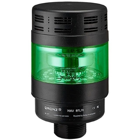 Qronz BTL70BK-AFG-QD24 1 stack LED tower light has a 70mm diameter. Rated for 24V DC. Green lens. Quick disconnect. 95dB alarm
