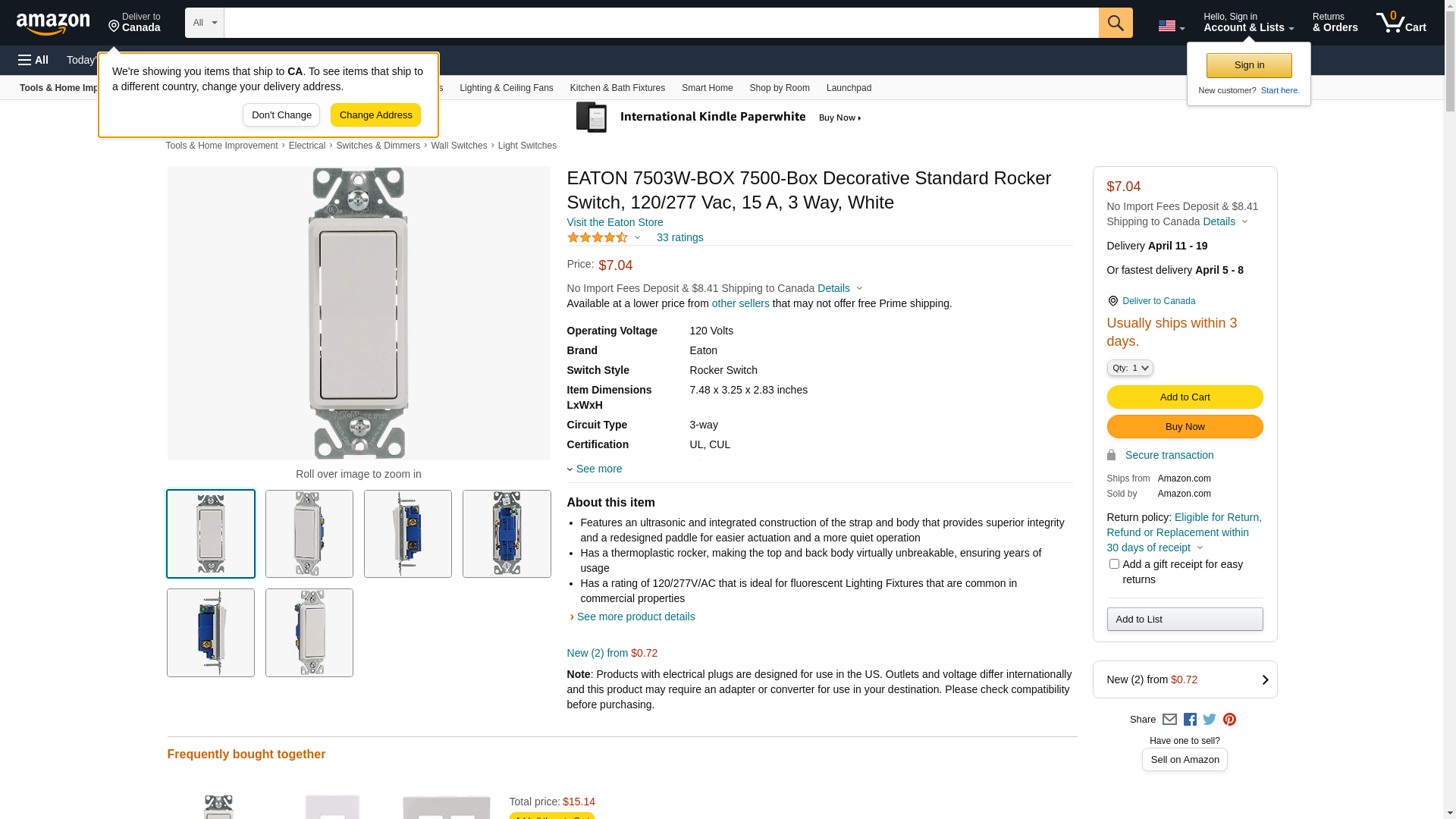 EATON 7503W-BOX 7500-Box Decorative Standard Rocker Switch, 120/277 Vac, 15 A, 3 Way, White