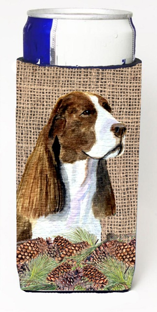 Caroline's Treasures SS4102MUK Springer Spaniel on Faux Burlap with Pine Cones Ultra Hugger for slim cans Can Cooler Sleeve Hugger Machine Washable Drink Sleeve Hugger Collapsible Insulator Beverage I