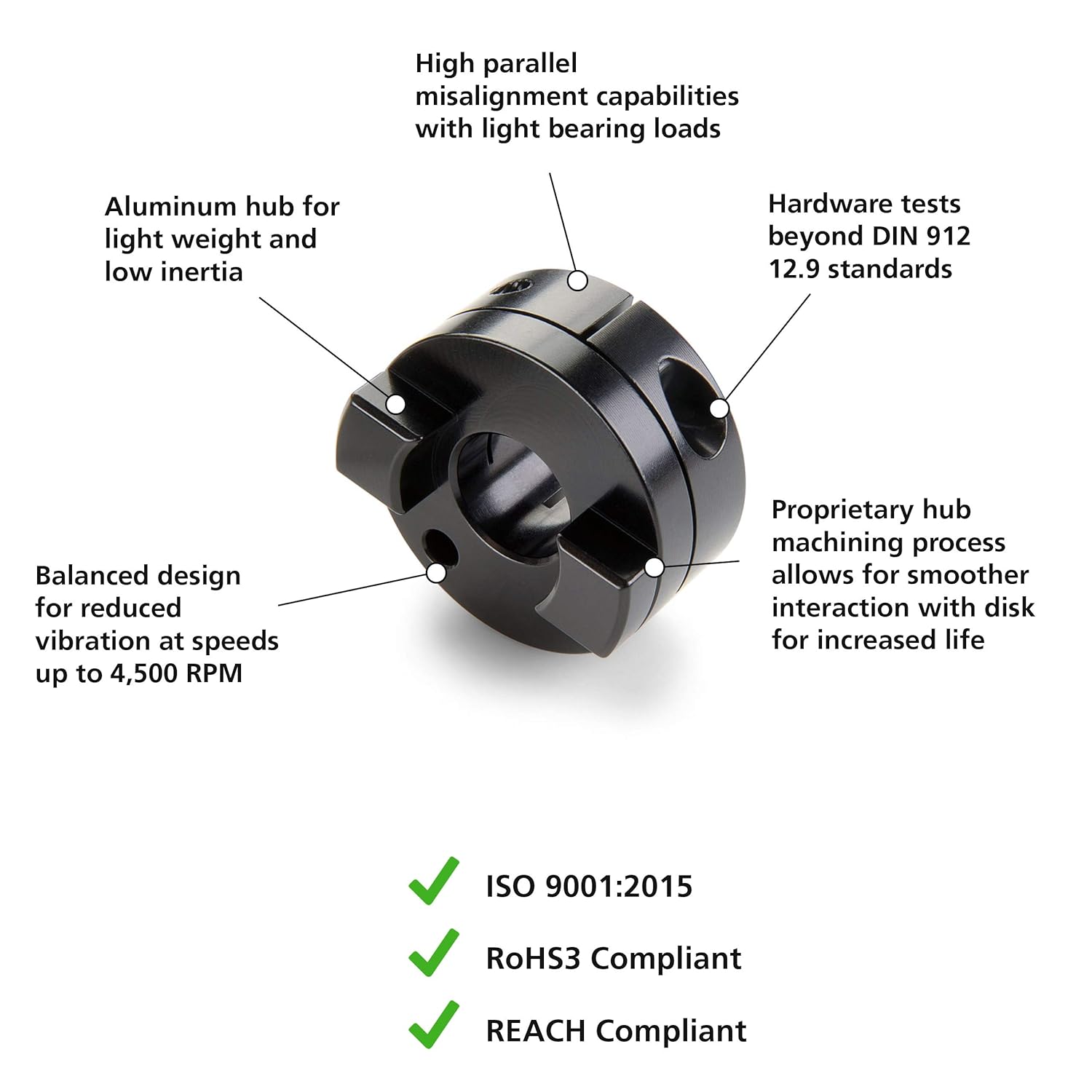 - Can accommodate high amounts of parallel misalignment (up to 10% of the hub OD). Acts as a mechanical fuse stopping power transmission during a torque overload.