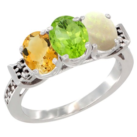 14K White Gold Natural Citrine, Peridot & Opal Ring 3-Stone 7x5 mm Oval Diamond Accent, sizes 5 - 10