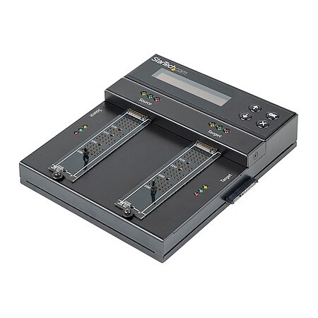 This flexible 1-to-1 drive duplicator and eraser provides a standalone solution for cloning and sanitizing hard drives (HDD) and solid state drives (SSD) without computers or software. The drive duplicator/sanitizer can clone drives at up to 7.5GB per minute, and supports a wide variety of drive types: M.2 PCIe drives (sized 2230/2242/2260/2280/22110) M.2 SATA drives (sized 2230/2242/2260/2280/22110) 2.5 in. SATA drives 3.5 in SATA drives Broad Drive Compatibility Supporting different types of drives including M.2 PCIe (M-Key), M.2 SATA (B+M-Key), and SATA 2.5/3.5 in. drives, this HDD/SSD cloner and wiper provides a versatile solution for drive cloning and deleting applications. The drive cloner enables duplication with any combination of drives, supporting duplication between M.2 (NVMe/AHCI), M.2 SATA, and 2.5/3.5"" SATA drive interfaces. You can also expand the capabilities of the device to supporting IDE and mSATA drives using StarTech.com drive adapters: SATA to IDE Adapter (SAT2IDEADP) / SATA to mSATA Adapter (SAT32MSAT257) (each sold separately). To ensure compatibility with your drives the duplicator and eraser has been rigorously tested with a wide variety of drive models from different drive manufacturer including Samsung 850, 860, 870, 950, 960, 970, WD, HP, and Intel. Configurable Duplication and Erase Modes To support a wide variety of applications this drive cloner and sanitizer supports different duplication and erasing modes with Adjustable Host Protected Area (HPA) settings to include/exclude partitions. When duplicating the device supports: System & File, All Partitions, Whole Drive and Percentage Duplication. When erasing the device supports: Quick Erase, Full Erase (Single & 3-Pass) and Secure Erase (Clear/Purge, meets NIST SP 800-88 Rev 1). Easy to Use Featuring an intuitive button-operated interface, and full on-screen