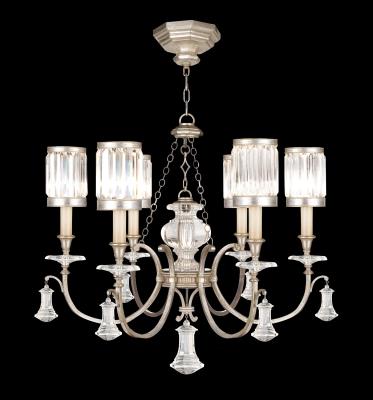The Fine Art Lamps 595440-2ST chandelier is from the Eaton Place Silver collection and measures 28H x 32W inches. The shades measure 4.5 x 4.5 x 6.5 inches. It uses (6) 60 watt candelabra base bulbs. The socket type is phenolic. This chandelier weighs 56 pounds. For international 220 Volt application, the 595440-2ST chandelier measures 71.12H x 81.28W cm. It uses (6) 60 watt candelabra base bulbs. The socket type is phenolic. This chandelier weighs 25.45 kilograms. Chandelier in warm muted silver leaf finish. Center section that holds the arms is mirrored underneath. Features shades of faceted channel-set crystal. Available in iron rustic finish: 595440.