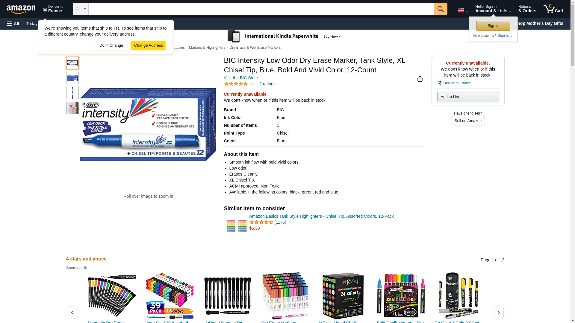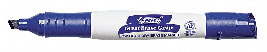 Grip area for comfort and control. For whiteboards, glass and most nonporous surfaces. Erases with a dry cloth or felt eraser. Low odor. Marker Type: Dry Erase; Color(s): Blue. UPC Code: 070330323285If you are not satisfied with the performance of this product, please return it to BIC and BIC will gladly replace it at no cost to you.Marker Type: Dry EraseColor: BlueTip Type: ChiselInk Types: Non-Washable