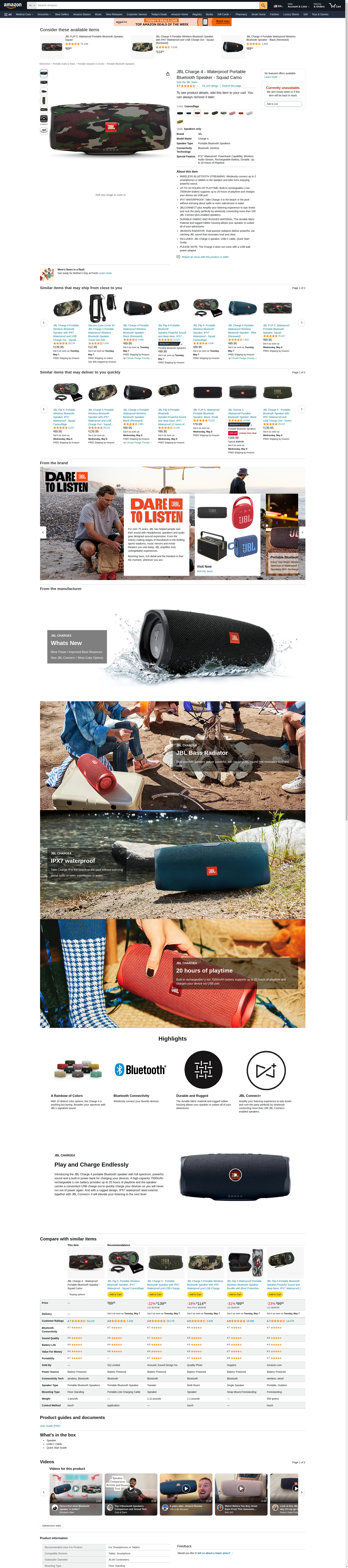 PRODUCT OVERVIEWIntroducing the JBL Charge 4 portable Bluetooth speaker with full-spectrum, powerful sound and a built-in power bank for charging your devices. A high-capacity 7500mAh rechargeable Li-ion battery provides up to 20 hours of playtime and the speaker carries a convenient USB charge out to quickly charge your devices so you will never run out of power again. And with a rugged design, IPX7 waterproof rated exterior, together with JBL Connect+ it will elevate your listening to the next levelKEY FEATURESWireless Bluetooth streaming20 hours of playtimeIPX7 waterproofJBL Connect+JBL bass radiatorConnector Type: 3.5Mm StereoPower Source Type: Battery Powered