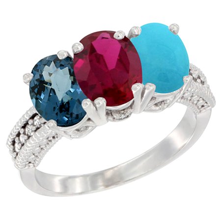 10K White Gold Natural London Blue Topaz, Ruby & Turquoise Ring 3-Stone Oval 7x5 mm Diamond Accent, sizes 5 - 10