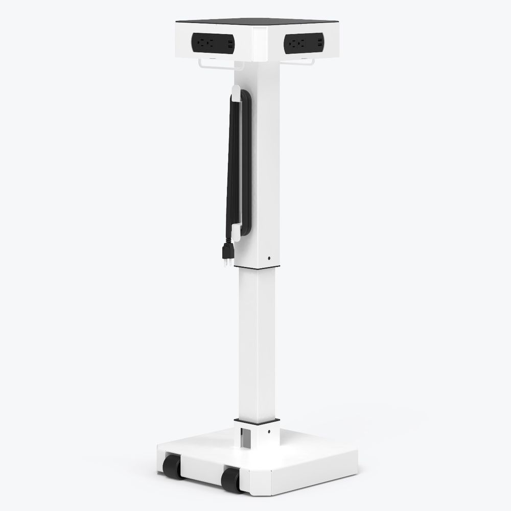 - Durable powder-coated steel frame with bright white finish. A pair of hidden casters enable easy transport throughout a classroom or workspace. Underside handles further facilitate transport of the mobile power tower