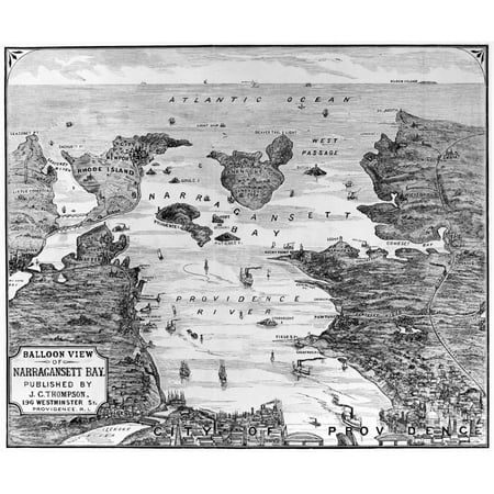 Stretched Canvas Art - Narragansett Bay, C1880. /Naerial View Of Narragansett Bay Seen From Above Providence, Rhode Island. Lithograph, C1880. - Medium 18 x 24 inch Wall Art Decor Size.