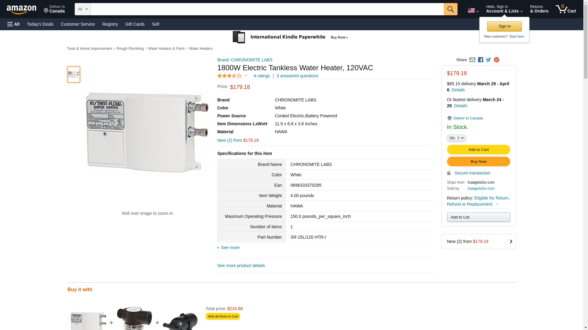 Chronomite SR-15L/120 HTR 120-Volt 15-Amp SR Series Instant-Flow Low Flow Tankless Water Heater
