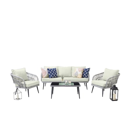 Manhattan Comfort Riviera Rope Wicker Metal 4Piece 5 Seater Patio Conversation Set Cushions Cream
