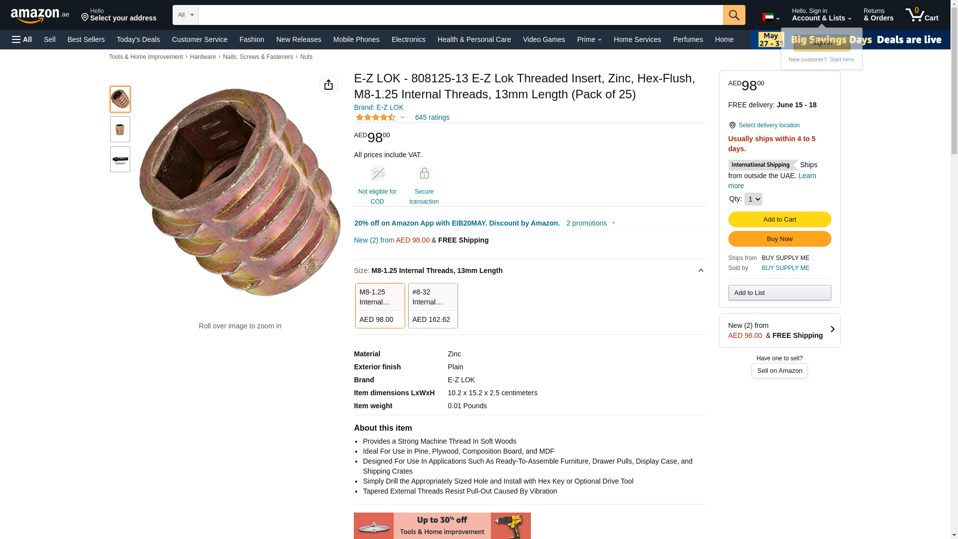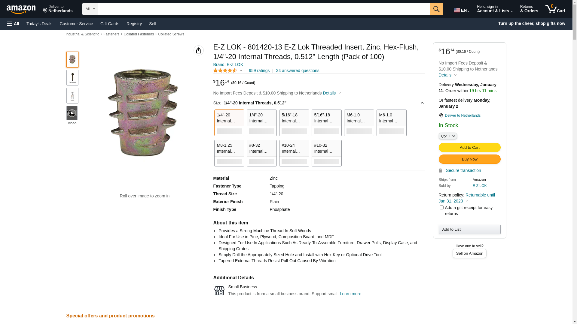 E-Z LOK - 801420-13 E-Z Lok Threaded Insert, Zinc, Hex-Flush, 1/4"-20 Internal Threads, 0.512" Length (Pack of 100)