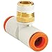 - <b>Price For:</b> Each <b>Tube Size</b>: 5/16 <b>Body Material</b>: Polybutylene Terephthalate <b>Basic Material</b>: Plastic <b>Pipe Size</b>: 1/4 <b>Standards</b>: RoHs <b>Fittings Sub-Category</b>: Tees <b>Temp. Range</b>: 23 Degrees to 140 Degrees F <b>Item</b>: Male Branch Tee <b>Connection Type</b>: Tube x Male BSPT <b>Hex Size</b>: 14mm <b>Color</b>: White/Orange/Gold <b>Max. Pressure</b>: 145 psi <b>Country of Origin (subject to change)</b>: Singapore