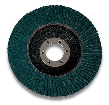 3M coated 546D Type 27 flap disc uses alumina zirconia as the abrasive material and has a diameter of 4 1/2 in. 3M incorporates this alumina zirconia material into the flap disc forming a grit of 40. All abrasive products that rotate or spin, such as the ones in this category, have a maximum speed at which you can run them. This 3M flap disc can be run at a maximum speed of 13300. The 3M flap disc uses fiberglass for the backing plate.