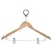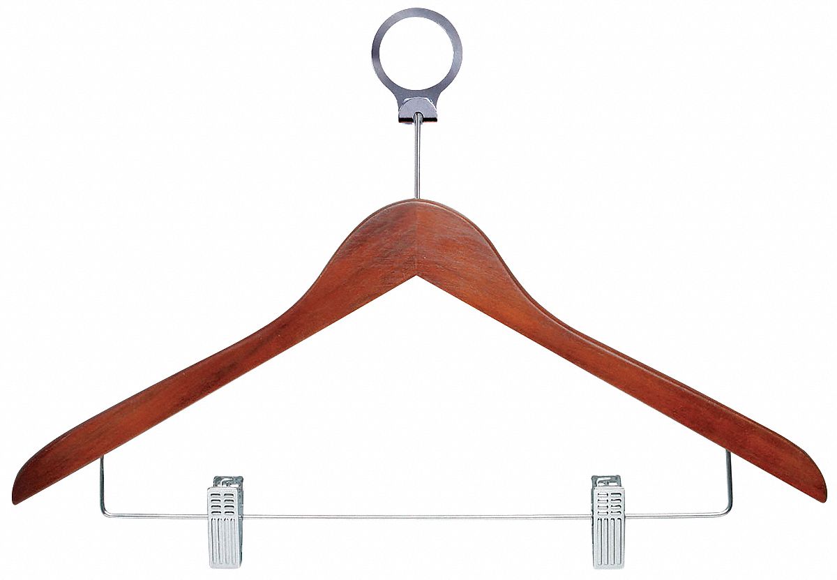 Beautiful, wooden clothes hanger has a contemporary design perfect for keeping shirts, dresses, and pants wrinkle-free. Hotel style circular bar hook stays put when installed on any standard closet bar. These hangers also work great on rolling garment racks, keeping hangers and clothes from falling off the rack during transport. When needed, hangers easily detach from the circular hook. Vinyl coated clips protect pants and skirts while holding them securely in place. A gorgeous upgrade for any closet space.