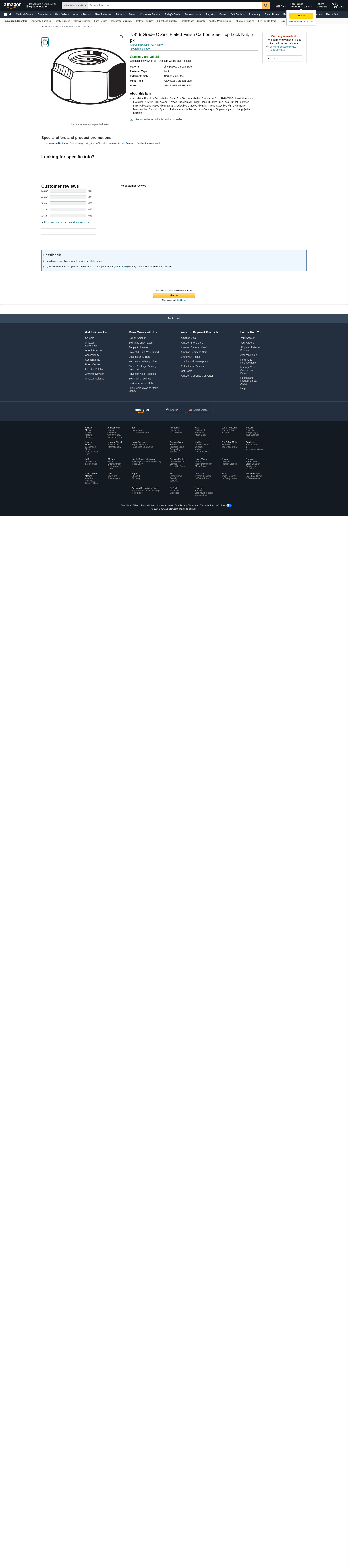 'Lock Nut, Nut Style Top Lock, System of Measurement Inch, Carbon Steel, Fastener Finish Zinc Plated, Fastener Thread Direction Right Hand, Fastener Thread Type UNC, Dia./Thread Size 7/8 In.-9, Material Grade Grade C, Width Across Flats 1-5/16 In., Nut Height 59/64 In., Nut Standards IFI-100/107, Package Quantity 5'