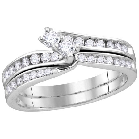Two diamonds side by side, just like the two of you! From our Hearts Together (TM) collection, this bridal set includes the engagement ring and wedding band, and has has two larger diamonds set side by side in the center of the design with a line of diamonds on the bands. There are a total of 30 diamonds with total diamond weight of 1/2 carat. 14k white gold.