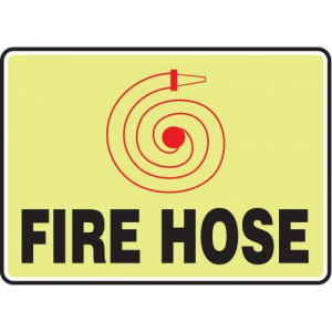 Accuform, MLFX544GP, 10" x 14" Glow Fire Safety Sign "Fire Hose" Lumi-Glow Plastic Features: .060 Plastic with 10-mil photoluminescent film Semi-rigid and impact resistant Rounded corners and 3/16 mounting holes on most sizes, will be adjusted for larger sizes Polycarbonate service temperature range: -20 to 149 F
