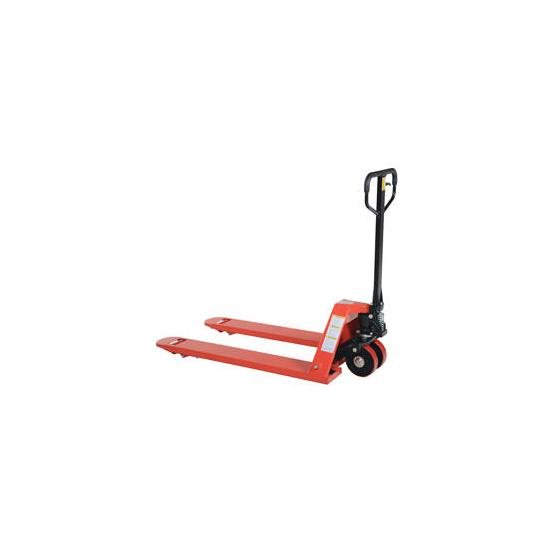 An economical way for one person to move heavy pallet loads without the use of a fork truck Includes two articulating steering wheels and two front load rollers Ergonomic design requires only 75 pounds of pulling force when fully loaded Steering wheels include bearing dust covers for added life Nose wheels are located on the front edge of each fork to assist in clean pallet entrance and exit Reinforced tripleformed steel forks provide twice the strength of standard singleformed forks Forks are 7 wide each Equipped with internally mounted solid steel adjustable push rods Spring loaded handle automatically returns to vertical position when not in use Hydraulic pump design facilitates easyaccess seal replacement Features. Requires seventyfive 75 pounds of pulling force when fully loaded. Steering wheels include bearing dust covers for added life. Pack of 6Specifications. Size 27 x 48 in. Capacity 6000 lbs. Weight 1444 lbs