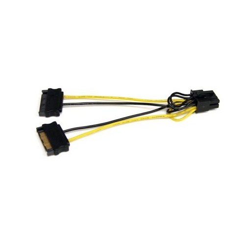 The Startech SATA Power to 8-Pin PCI Express Video Card Power Cable Adapter features a PCI Express power connector as well as two 15-pin SATA male power connectors. This provides a cost-effective way to connect a PCIe video card to Serial ATA power connectors provided by the computer power supply, eliminating the need to upgrade the power supply for the sake of video card compatibility. It's expertly designed and constructed of top quality materials.Startech SATA Power to 8-Pin PCI Express Video Card Power Cable Adapter:1 x 8-pin PCI Express (female) connector to 2 x 15-pin SATA (male) connectorsGold-plated SATA connectorsLength: 6"