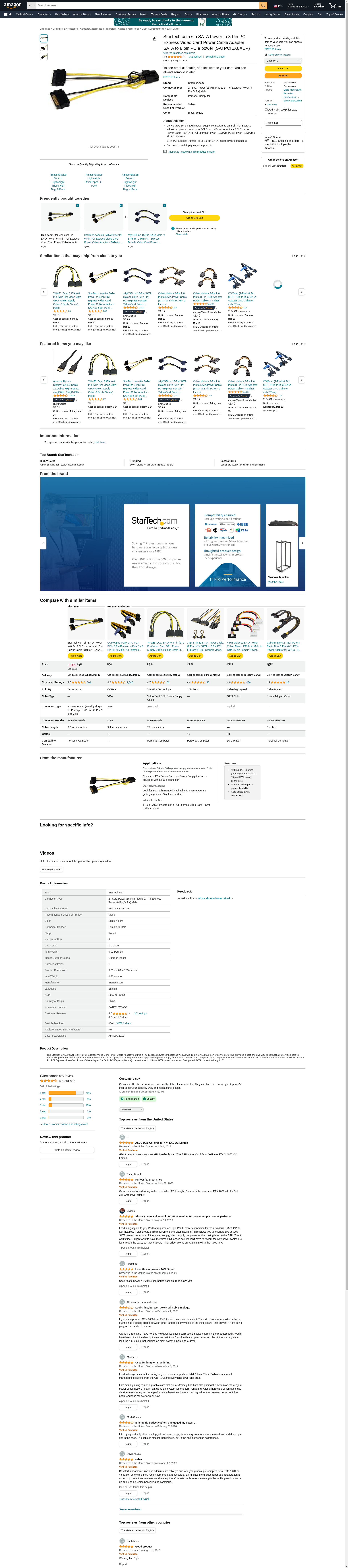 StarTech Accessory SATPCIEX8ADP 6inch SATA Power to 8 Pin PCI Express Video Card Power Adapter Retail