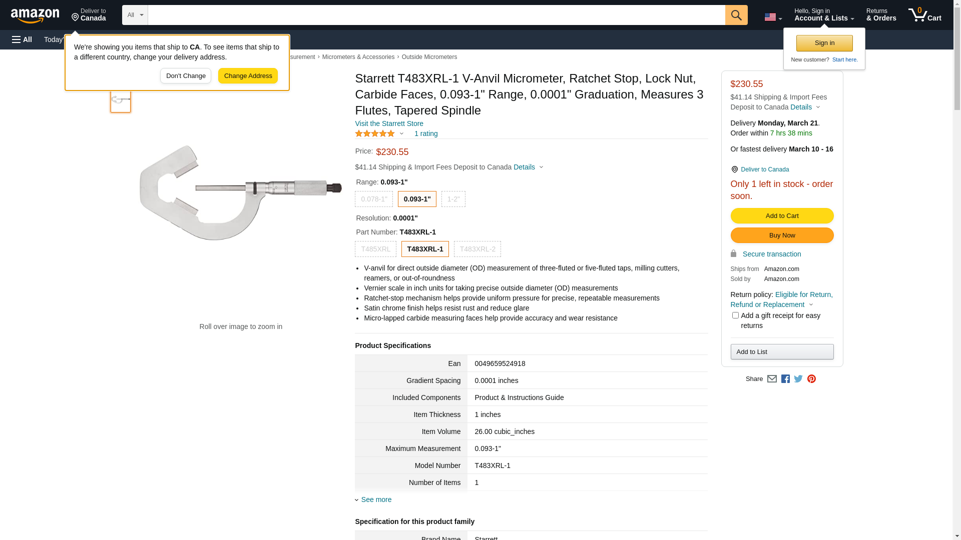 Starrett V-Anvil Micrometer- .093-1"- .0001" Grad Rohs Compliant: Na - T483XRL-1