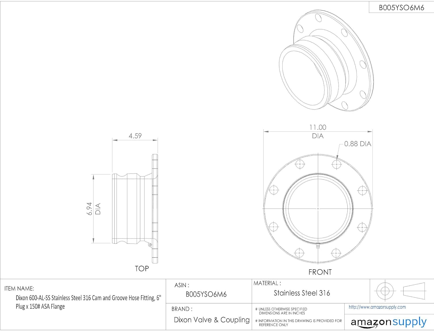 Dixon 600-AL-SS Stainless Steel 316 Cam and Groove Hose Fitting, 6" Plug x 150# ASA Flange