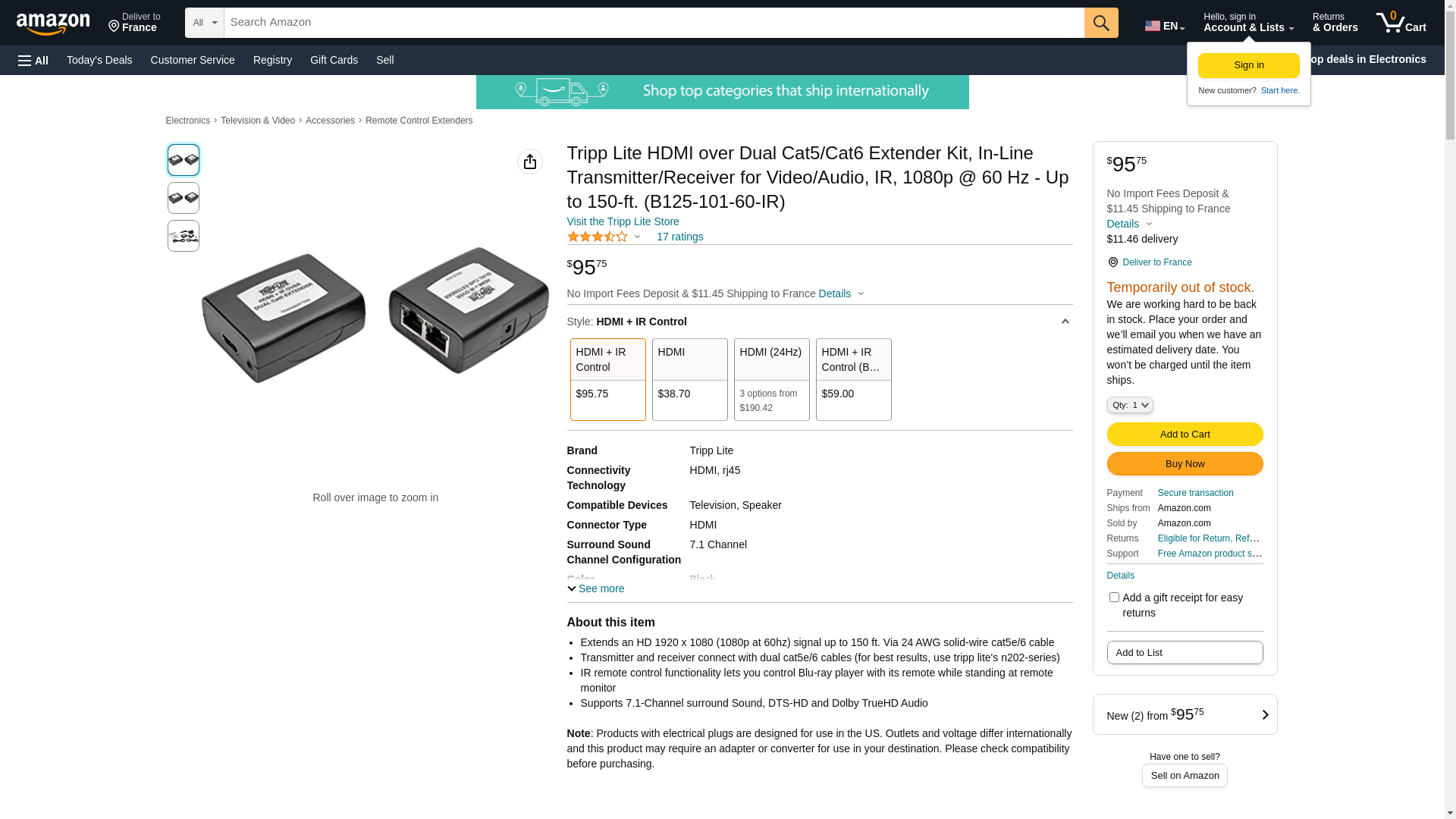 Tripp Lite HDMI over Dual Cat5/Cat6 Extender Kit, In-Line Transmitter/Receiver for Video/Audio, IR, 1080p @ 60 Hz - Up to 150-ft. (B125-101-60-IR)