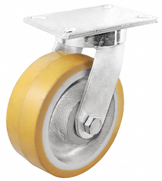 Swivel, Kingpinless Plate Caster, Load Rating 2500 lb., Swivel Lock Type No Lock Included, Wheel Dia. 8 In., Wheel Width 3 In., Wheel/Tread Material Polyurethane, Wheel Core Material Cast Iron, Non-Marking Yes, Number of Wheels 1, Caster Brake Type No Brake Included, Tread Shape Standard