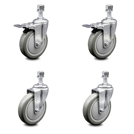 Polyurethane Swivel Threaded Stem Caster Set of 4 w/5" x 1.25" Gray Wheels and 1/2" Stems - Includes 2 with Total Locking Brake - 1400 lbs Total Capacity - Service Caster Brand