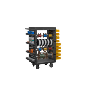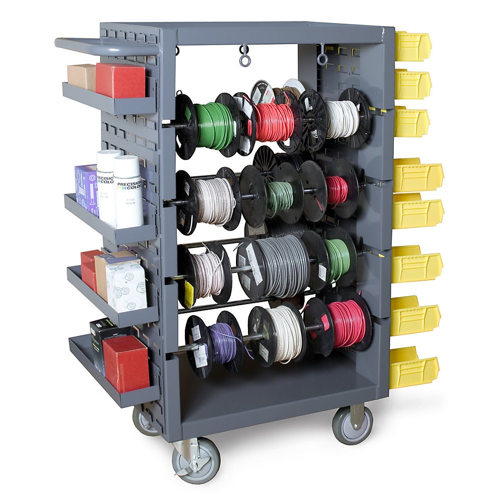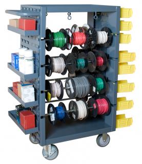 Great for 5-S and other lean manufacturing initiatives, DURHAM Mobile Spool Cart organizes and stores multiple spooled items and tools. Eight (8) 23" long axles have 7-1/2" space between to accommodate wire spools. Axles can be removed to accommodate different sized spools. Other features include: louvered panels on each end for hook-on bins and trays (bins and trays not included), smooth work surface with 1-1/2" lip to keep items in place, and four wire guides below work surface to aid in cutting wire. Welded handle maneuvers cart on (4) 5" bolt-on polyurethane casters2 rigid, 2 locking swivel. Heavy-duty 14-gauge steel with durable powder coat finish. Color: gray. Ships assembled.