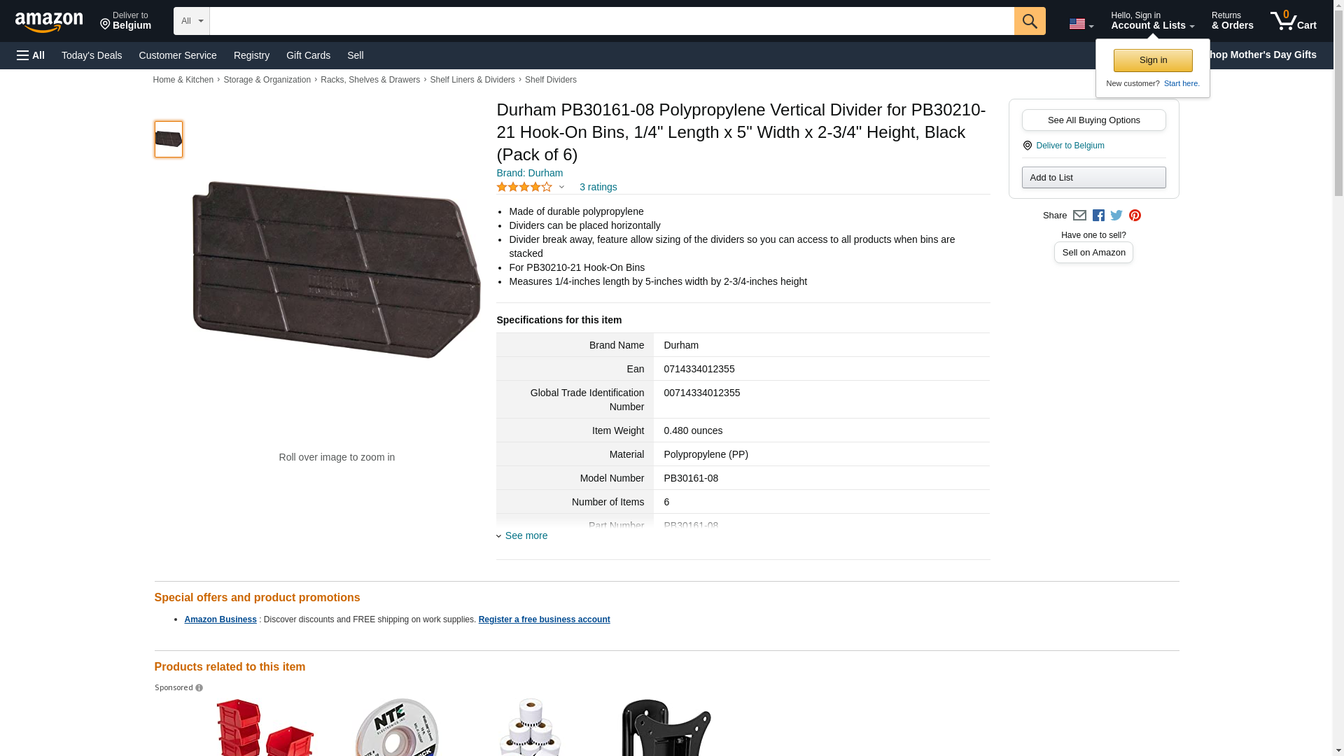 Durham PB30161-08 Polypropylene Vertical Divider for PB30210-21 Hook-On Bins, 1/4" Length x 5" Width x 2-3/4" Height, Black (Pack of 6)