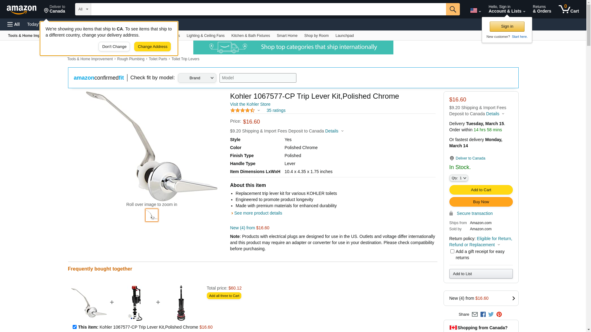 Kohler 1067577-CP Trip Lever Kit,Polished Chrome
