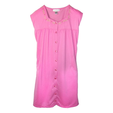 <ul> <li>Feminine floral embroidery at neckline</li> <li>Satin covered buttons</li> <li>Side seam pockets for convenience</li> </ul>