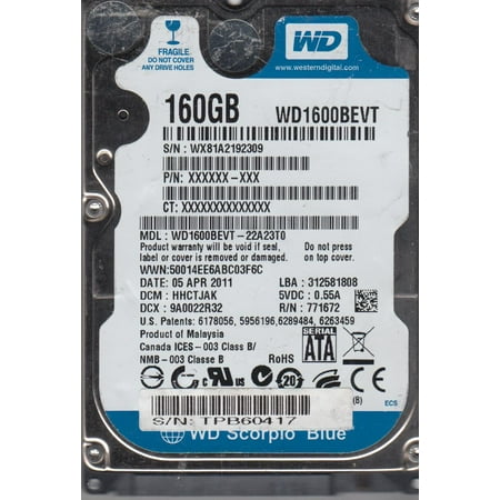 <p>HDD with Serial Number: WXC1A40X7380<br />Model: <b>WD1600BEVT-22A23T0</b><br />Date: <b>02 MAY 2010</b><br />DCM: <b>HEMTJANB</b><br />Product of: <b>Thailand</b><br />PCB Sticker: <b>2061-771672-F04 AA</b><br />PCB Revision: <b>2060-771672-004 REV A</b></p> <p>Micro Jogs<br />------------------------------<br />LH : PH : Micro Jog (Hex/Dec)<br />------------------------------<br />0 : 0 : A42/2626<br />1 : 1 : ABC/2748<br /><br />ROM F/W version......................... : 00140028<br />Preamp vendor........................... : 0x0001<br />Preamp revision......................... : 0x0000</p> SKU: 20058 <br /> <br /><br /> The item included is exactly what is on the picture. Picture is not a stock photo; it is the picture of an actual item sold. If item description and the picture vary, please contact us for clarification. We will gladly look up any other information about this hard drive or PCB, in case the information that you are looking for is not specified in the listing and not clear on the picture.