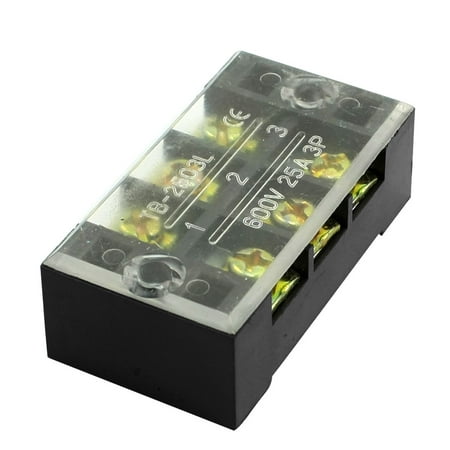 <ul> <li>Rating : 600V,25A;Poles : 3 Position, Dual Row</li> <li>Mounting Hole Dia : 4mm/0.16";Size : 55 x 30 x 19mm/ 2.2" x 1.2" x 0.7"(L*W*H)</li> <li>Color : Black, Clear;Net Weight : 29g</li> <li>Package Content : 1 x Barrier Terminal Block</li> </ul>