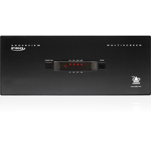 Professional USB, quad-VGA, 4-port KVMA switch with USB true emulation technology. AdderView PRO VGA MultiScreen is designed to enable four multihead computers to be controlled from a single high resolution KVM console using high definition analog VGA video links. The switch makes use of Adder's True Emulation technology which enables USB HID devices to be continuously emulated to each computer. This unique technology enables instantaneous and reliable hotkey switching while also supporting the extra keys and features of enhanced keyboards and mice. Furthermore, AdderView PRO VGA MultiScreen includes two independently switchable USB 2.0 channels and an audio channel, giving the user the flexibility to attach selected peripherals to different computers. High Definition VGA with Extended Profile DDC EDID The AdderView PRO Multi Screen features high resolution VGA video with extended profile DDC EDID. The extended DDC EDID profile ensures that the switched graphics card is always optimised to work with your screen. The high definition analog VGA video capabilities enable users to work at very high resolutions on each head for resolution intensive applications such as medai/graphic design or detailed medical imaging.