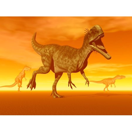 Three Monolophosaurus dinosaurs in the desert by sunset Poster Print
