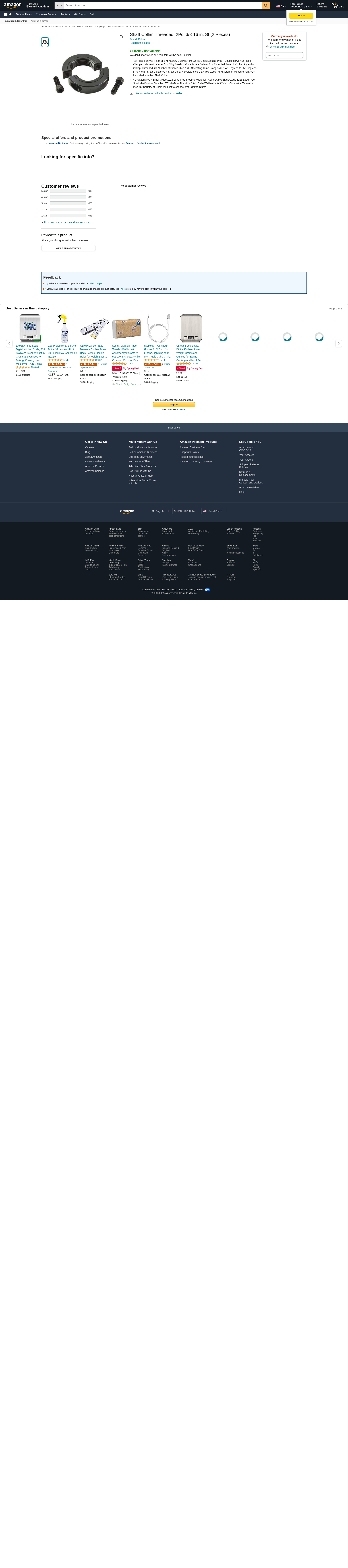 'Shaft Collar, System of Measurement Inch, Shaft Locking Type - Couplings 2 Piece Clamp, Bore Type - Collars Threaded Bore, Bore Dia. 3/8 In.-16, Material - Collars Black Oxide 1215 Lead Free Steel, Outside Dia. 7/8 In., Width 0.343 In., Clearance Dia. 0.999 In., Screw Size #6-32, Screw Material Alloy Steel, Operating Temp. Range -40 Degrees to 350 Degrees F'