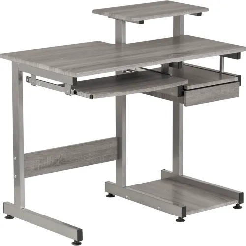 - This Techni Mobili Complete Space Saving Computer Workstation lends an air of traditional workmanship to its versatile contemporary design. The sturdy design is made of heavy-duty engineered wood panels with a moisture resistant PVC laminate veneer and a scratch-resistant powder-coated steel frame. The keyboard shelf , adjacent shelf and utility drawer are all mounted on slide out tracks featuring safety stops and have a 30 lbs. weight capacity. The spacious desktop can hold up to 80 lbs
